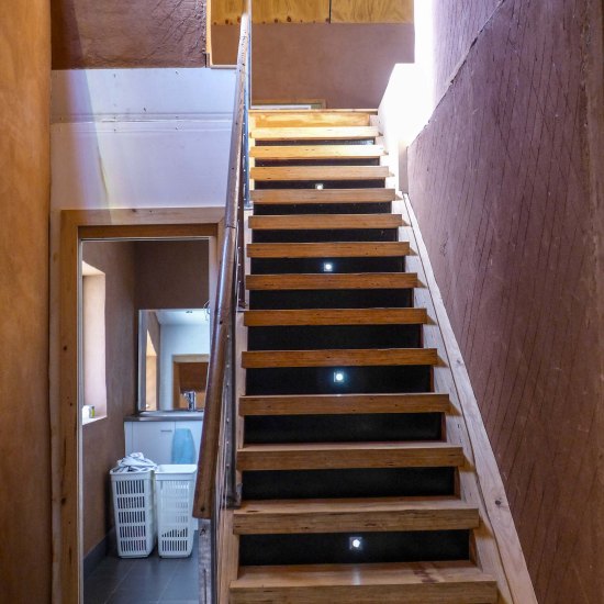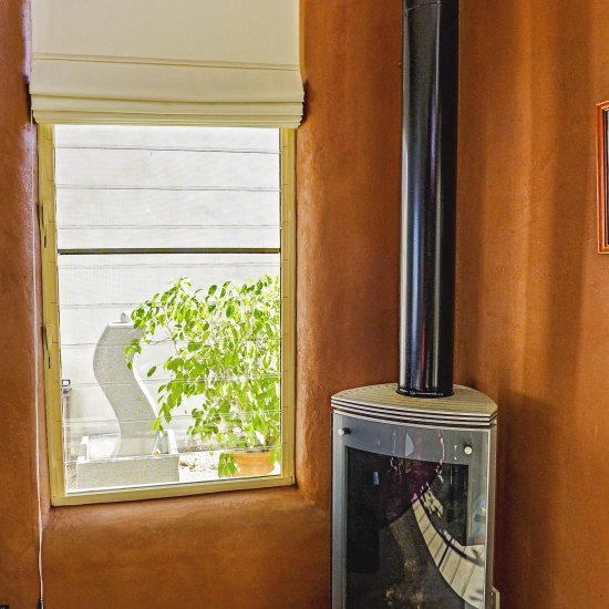 With straw bale walls and north-facing windows, all that’s needed in the living room in winter is a small heater.