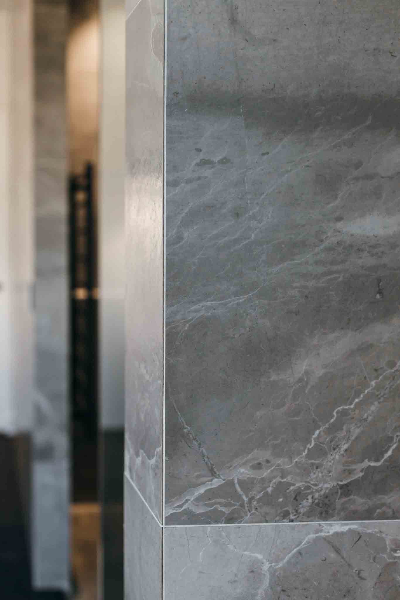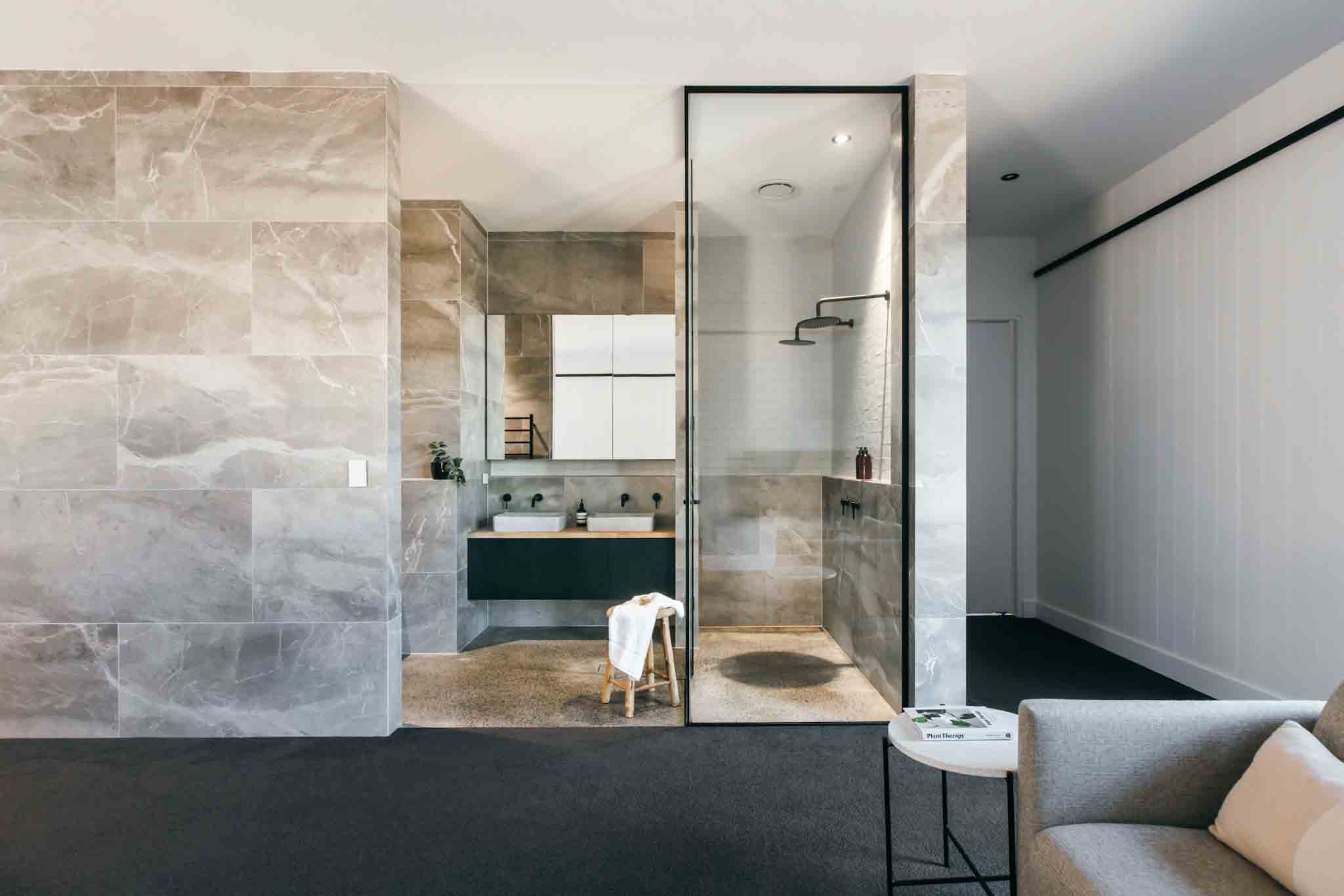 The open plan ensuite to the main bedroom is completely tiled with marble-look large format tiles, including the outside of the wall with the bedroom. The initial all-white idea seemed too stark; the darker, more natural tiling has completely changed the look and feel of the room – it almost feels like being outdoors.
