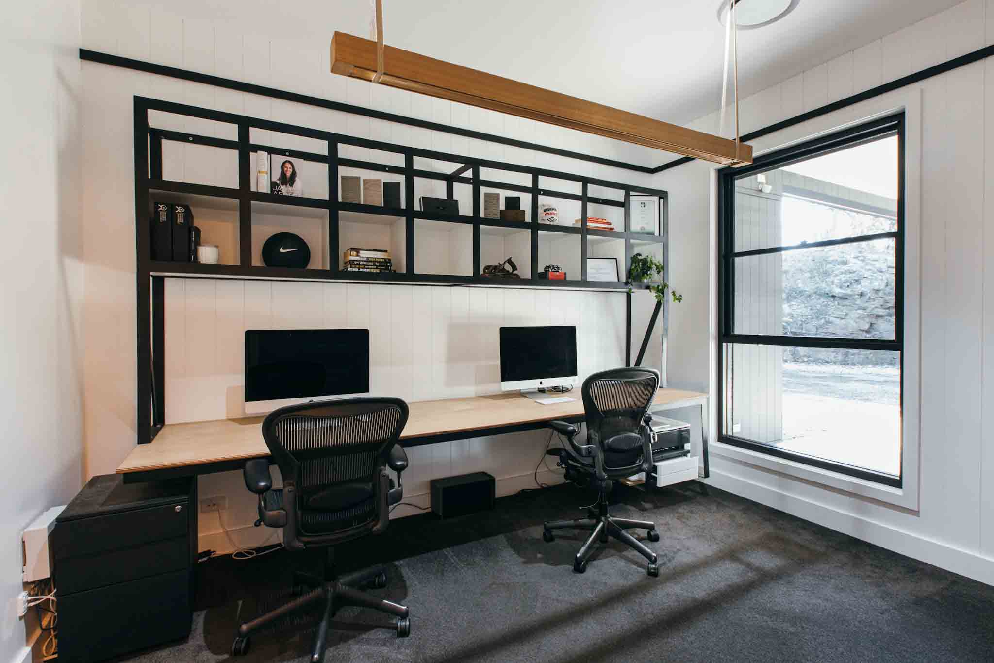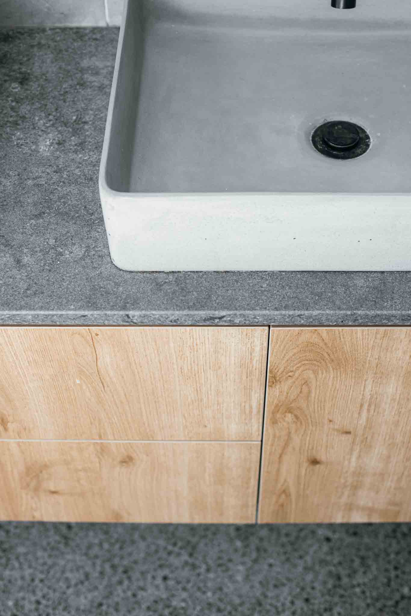 As Damir works from home, his office and the mudroom are adjacent to the front door. The area can be separated from the main house by closing a self-built cavity door, which is a made with a Corten-look product by Laminex. This offers privacy for when clients visit the office. The mudroom includes loads of storage for shoes, coats, sport equipment… all the paraphernalia of a family household! As per the original brief, the front door does not face the street and is partly concealed. This makes for fun and games with deliveries! The bonus is that there is no direct view into the house from the street, especially bearing in mind that the front door is glass.