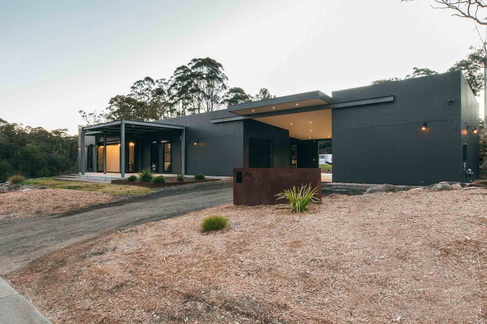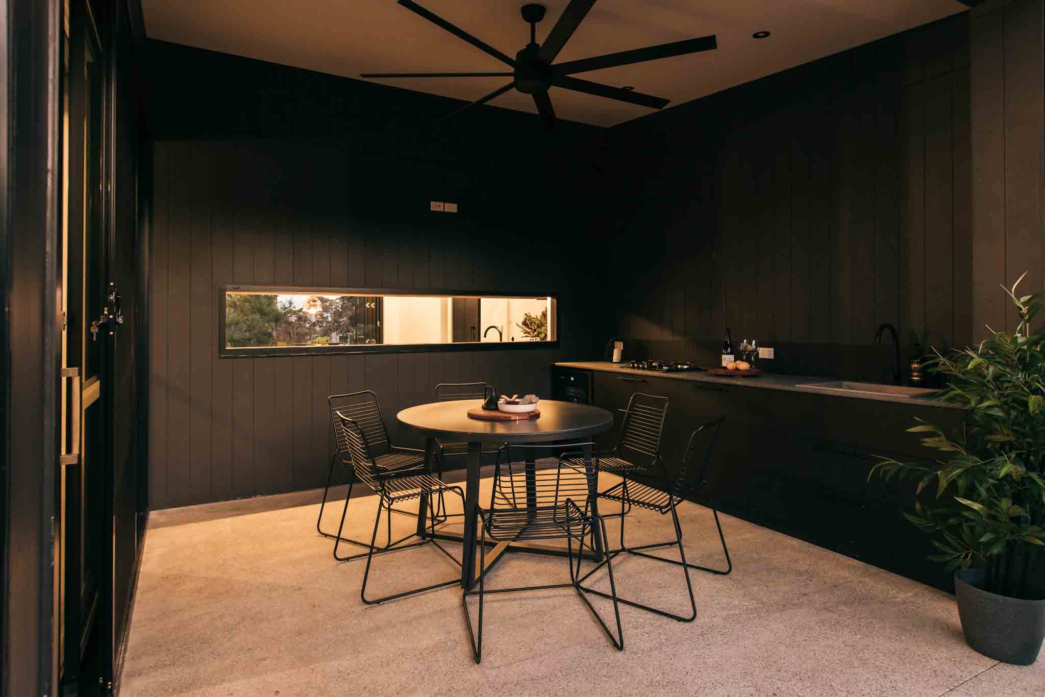 Damir says, ‘Our brief was to have a home with a drive-through carport, workshop and garage all under the one roof. Unconventionally, Emma and I wanted it to be black in colour, industrial/minimalist and art gallery-like in design, with high ceilings and for the entry door to be concealed from the street. For future use, it needed to incorporate adaptable principles and wifi intelligent controls. The land is classified as Environmental Conservation (E2), which defined the required setbacks of the dwelling from powerlines, sewer mound and street front. Most importantly, the home was to be built to stringent flame zone specifications, requiring it to withstand the harshest bushfire conditions of being engulfed by fire. The block is classified as FRL (Fire Resistance Level) BAL-FZ (Bushfire Attack Level Flame Zone).’