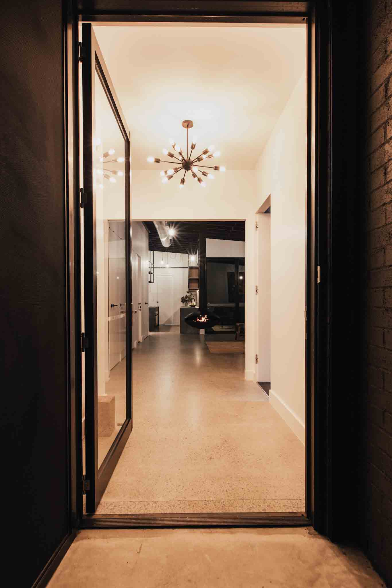 Exposed stainless steel AC ducting, LED ‘lightbulbs’ and lighting from Fat Shack Vintage add to the industrial feel. Saturn Zen light and power switches by Clipsal are sleek and understated. The suspended Aurora metal fireplace is very efficient and doubles as a stunning feature.